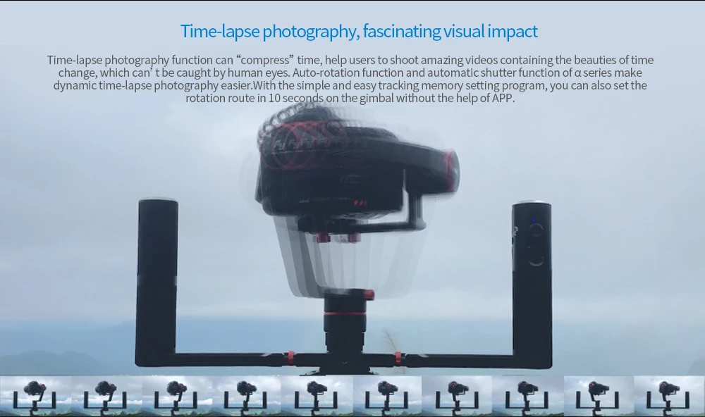 - Intelligently follow pre-set route in auto-rotation mode, matching motion time-lapse or automatic shooting.