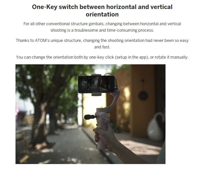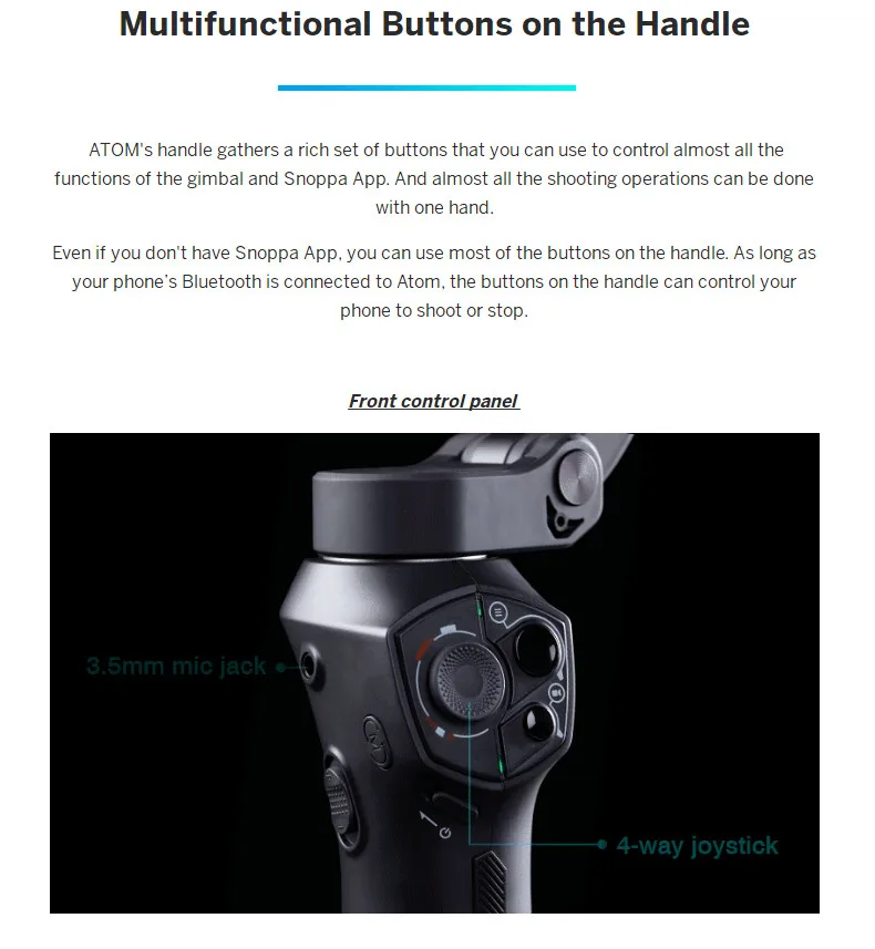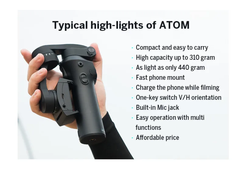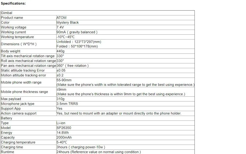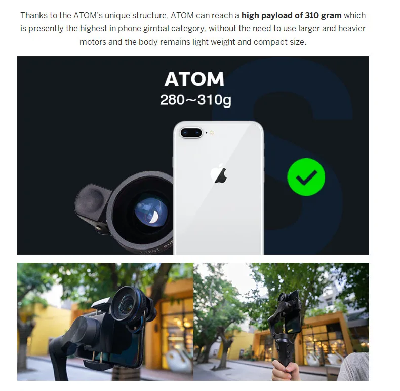 The ATOM completely reinvents the conventional 3-axis phone gimbals with its lightweight portability, rich functionality and expanded APP extensions. Features : Multifunctional buttons on the handle Flexible Tracking Modes One-Key switch between portrait /Lanscape mode Zoom & Fcous control Face track &Object track Unrestricted heading Rotation More advance APP features A Mic Interface for Third-Party Microphones Action camera support Supports Wireless /wired phone Charging Super Long Runtime(23-24hrs) Specifications: Working voltage:7.4V Working current:90mA(gravity balanced) Working temperature:-10℃~45℃ Dimensions(W*D*H) Unfolded:123*73*297(mm) Folded:50*106*178(mm) Tilt axis mechanical rotation range:330° Roll axis mechanical rotation range:330° Pan axis mechanical rotation range:360°(free rotation) NOTE: Snoppa app is available for Version iOS 8.0 & Android 6.0 or Higher. Version iOS: iPhone 5s/SE/ 6/ 6 Plus/ 6s/6s Plus/ 7/ 7 Plus,iPhone 8/8 Plus/X/ Xs/ Xs Max/Xr Version Android: Nexus 6p Samsung S7 edge Huawei P10/P10 Plus/P9/Mate 10/ Mate 9/ Mate 8, Xiaomi 6, Oppo R9s If you are an ANDROID user and can not stand some bugs in the App before it become perfect for your smartphone, contact the seller before the purchase to make sure you will get the function you need.