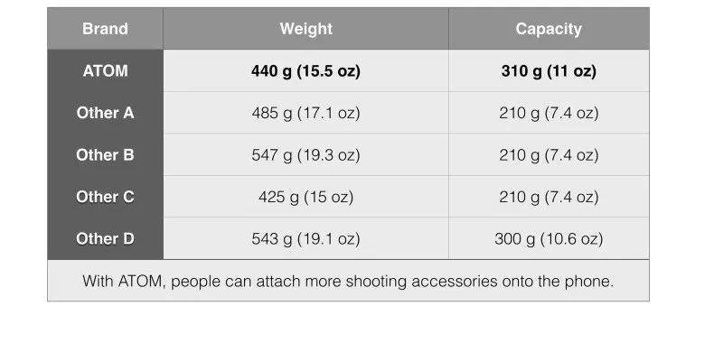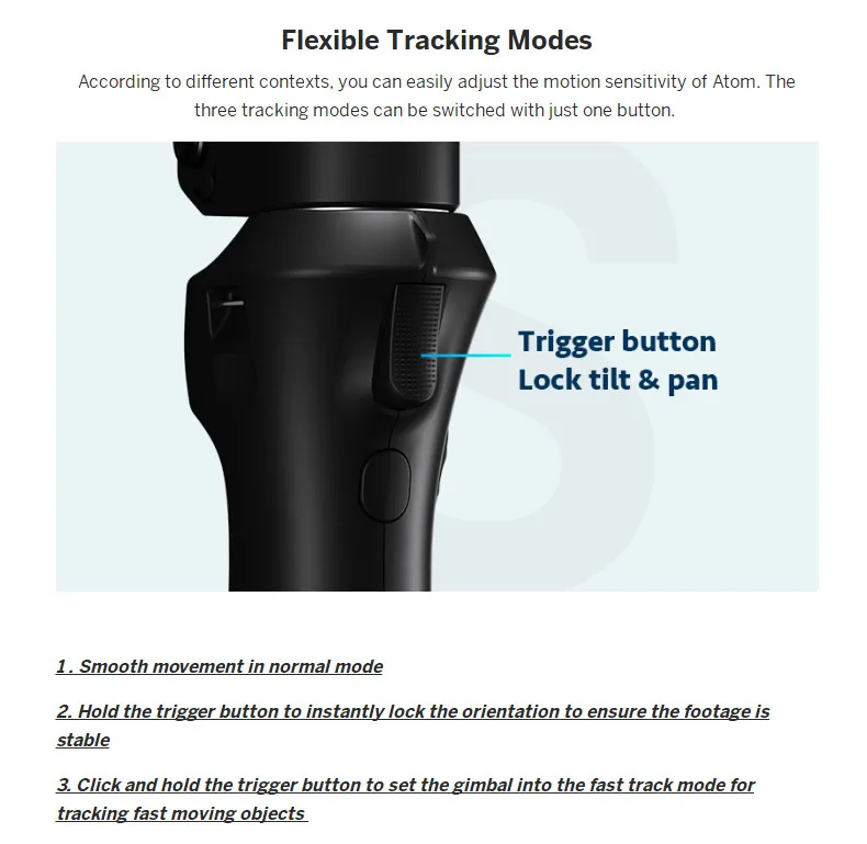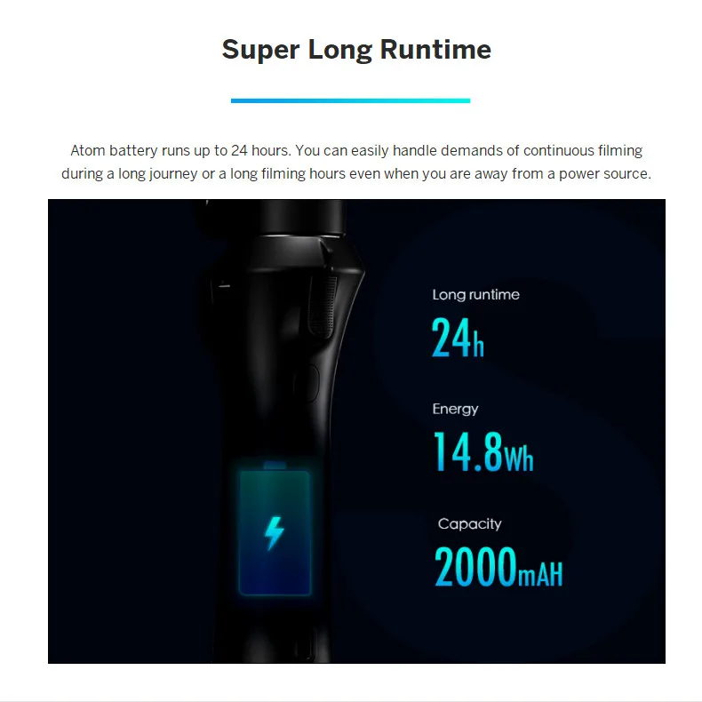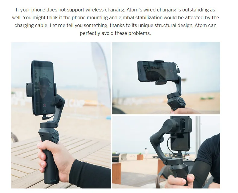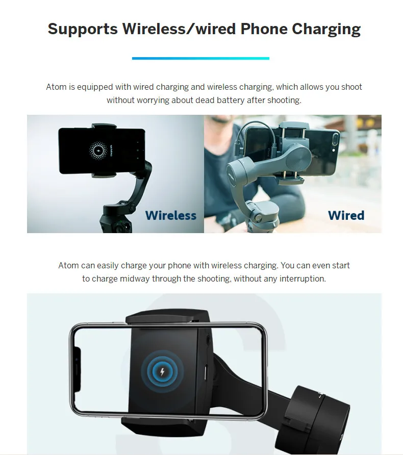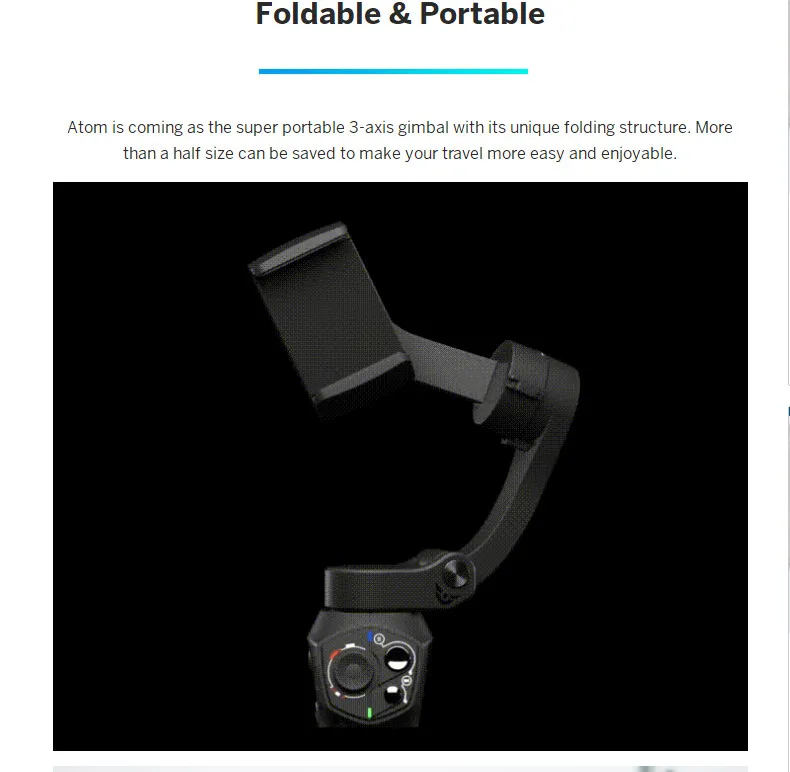 The ATOM completely reinvents the conventional 3-axis phone gimbals with its lightweight portability, rich functionality and expanded APP extensions. Features : Multifunctional buttons on the handle Flexible Tracking Modes One-Key switch between portrait /Lanscape mode Zoom & Fcous control Face track &Object track Unrestricted heading Rotation More advance APP features A Mic Interface for Third-Party Microphones Action camera support Supports Wireless /wired phone Charging Super Long Runtime(23-24hrs) Specifications: Working voltage:7.4V Working current:90mA(gravity balanced) Working temperature:-10℃~45℃ Dimensions(W*D*H) Unfolded:123*73*297(mm) Folded:50*106*178(mm) Tilt axis mechanical rotation range:330° Roll axis mechanical rotation range:330° Pan axis mechanical rotation range:360°(free rotation) NOTE: Snoppa app is available for Version iOS 8.0 & Android 6.0 or Higher. Version iOS: iPhone 5s/SE/ 6/ 6 Plus/ 6s/6s Plus/ 7/ 7 Plus,iPhone 8/8 Plus/X/ Xs/ Xs Max/Xr Version Android: Nexus 6p Samsung S7 edge Huawei P10/P10 Plus/P9/Mate 10/ Mate 9/ Mate 8, Xiaomi 6, Oppo R9s If you are an ANDROID user and can not stand some bugs in the App before it become perfect for your smartphone, contact the seller before the purchase to make sure you will get the function you need.